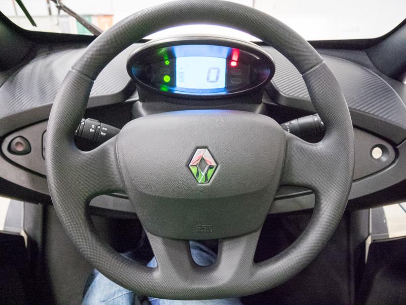 Twizy on pääsääntöisesti plussakelin ajoneuvo, sillä siinä ei ole lämmityslaitetta ja sivuikkunatkin puuttuivat. Ovet Suomeen tuotavissa malleissa sentään on, vaikka jossain maissa nekin ovat lisävaruste. Ilmava hytti oli kuitenkin ison tuulilasin ansiosta varsin suojaisa ja sillä tarkeni ajaa +4 asteen kelissä ihan hyvin normaaleissa ulkovaatteissa. Ennakkoon jännitin myös hieman sitä, miten ravassa olisin ikkunattomalla autolla ajamisen seurauksena, mutta ihmeellisesti edes ohi ajaneet linja-autot eivät onnistuneet kastelemaan, vaikka sumupilven nostattivatkin märästä asfaltista.