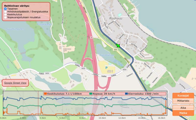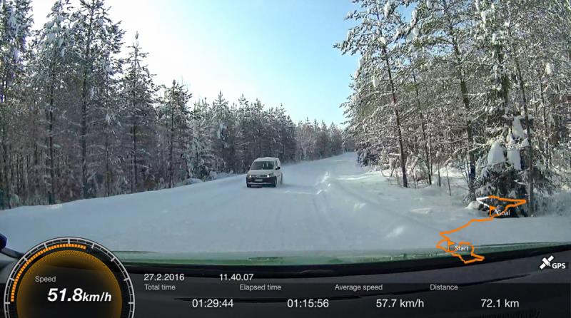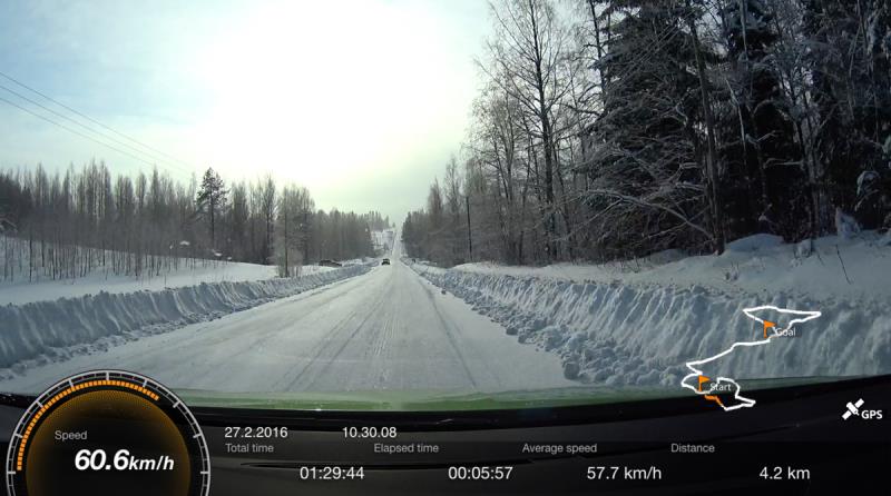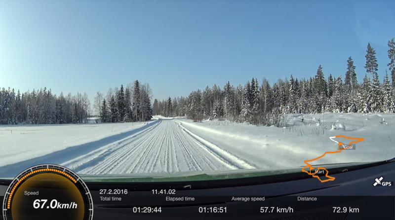 Omaan muistiin ei voi aina luottaa, mutta kyllähän nyt blogaaja-insinööriltä löytyy autosta laitteita, jotka tallentavat GPS-jäljen ja jotka tässä tapauksessa vahvistivat nopeusmielikuvani todeksi. Joulupukin tuoman Sonyn actionkameran mukaan nopeuteni oli tutkaa lähestyessä 57-62 km/h. Kameran GPS ei välttämättä ole tarkin mahdollinen (tuo 57 km/h oli outo pudotus), mutta en oikein usko, että se olisi näyttänyt 7 km/h liian vähän. Driveco-ajotavanseurantalaitteen kartalta oli hankalampi löytää tutkan tarkka sijainti, mutta ko. suoralla nopeus oli senkin mukaan ollut max 65 km/h. Jälkimmäisestä tutkakohdasta minulla ei ole videomateriaalia, koska kamerasta loppui akku muutamaa kilsaa aiemmin, mutta Drivecon mukaan ajoin tutkan alueella kuitenkin max. 39 km/h nopeudella.