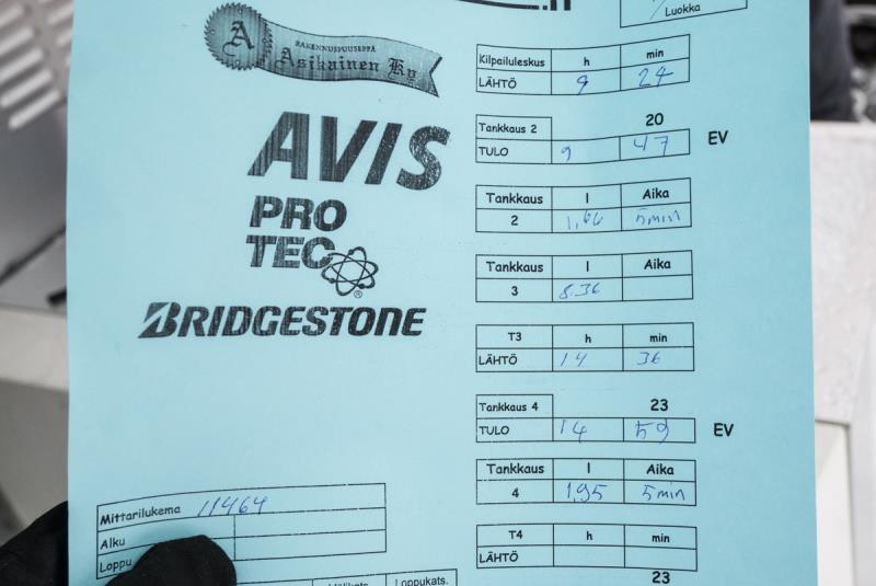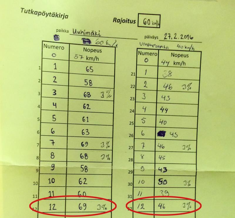 Hämmästys olikin sitten suuri, kun kisan jälkeen viralliselta ilmoitustaululta löytyi taulukko, jonka mukaan olin ajanut molempien tutkien ohi ylinopeutta. Ekassa nopeus oli ollut 69 km/h ja toisessa 46 km/h, minkä seurauksena loppukulutukseen lisättiin 6 %. Mitä ihmettä? Juuri kun olin varma, että olin ajanut riittävän hitaasti!
