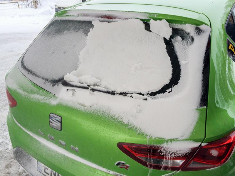 Kaikki lumi ei suostunut pysymään tiellä, vaan auto keräsi sitä mukaan parhaansa mukaan. Takaikkuna muurautui niin tahdilla umpeen, että jossain vaiheessa oli turha enää koittaa pitää sitä auki pyyhkimellä. Lopussa useamman sentin kerros, vaikka osa siitä oli jo tipahtanut isona levynä matkalle.