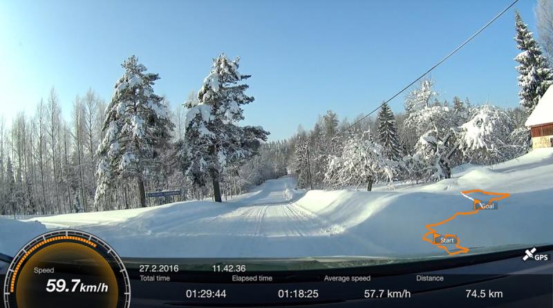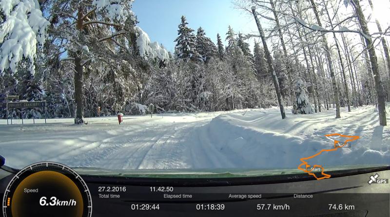 Kartanlukijan kannalta tämä oli kyllä melko tylsä kisa, koska nuo huoltoasemalta lähteneet lenkit olivat tosiaan lenkkejä, joihin ei kovin montaa käännöstä mahtunut. Muutama risteys ja nopeudenmuutos lähinnä. Onneksi eka ja viimeinen etappi olivat vähän jännittävämpiä. Hetkellistä jännitystä lumisilla metsäteillä saatiin kyllä siinä, kun yhdessä vaiheessa keskellä tietä tuli vastaan auto, jonka kuski ei katsonut eteenpäin ollenkaan. Näkyi vaan kun pää oli ihan alas painuneena, olikohan kiinnostavampaa sisältöä sylissä kuin tiellä? Onneksi sentään väisti vähän juuri ennen kuin oli kohdalla.