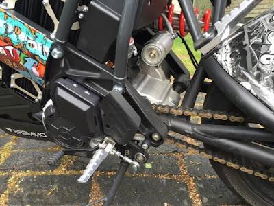 Tämä lisätekniikka ainakin osaltaan vaikuttaa siihen, että Brammo on 200 kg painollaan hieman Zeroa painavampi, mutta edelleen minun kokemuksiini perustuen kevyt pyörä. Moottori, kytkin ja vaihteisto ovat hyvin tiivis paketti pyörässä. Toisioveto on hoidettu tukevalla ketjulla.