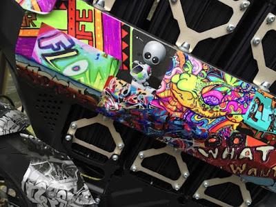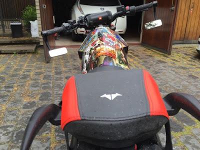 Kari on teipannut koko pyörän. Teippaus on osittain hänen omaa grafiikkaansa ja osittain anonyymien paikallisten grafiittitaiteilijoiden käsialaa. Erittäin onnistunut kokonaisuus tämä teippaus, joka korostaa pyörän machoa steetlookkia.