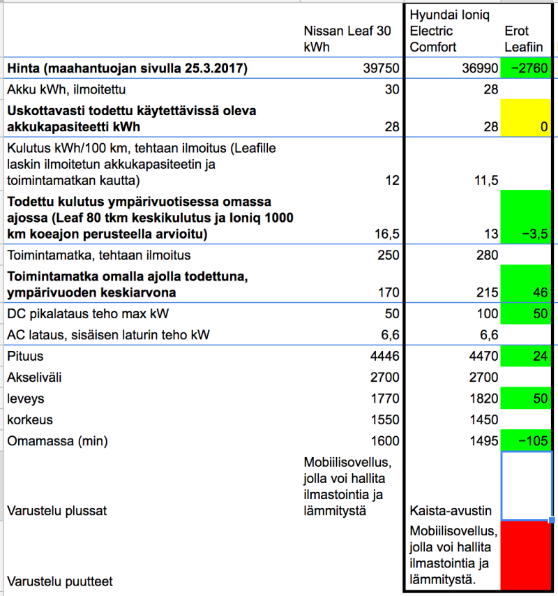 Alla on taulukossa vertailua 30 kWh Leafin ja Ioniqin välillä minulle itselle merkittäviä kohtia poimien. Kyllä tuo nyt on aika selvää että omassa arvostuksessan Ioniq meni nyt ykköseksi.