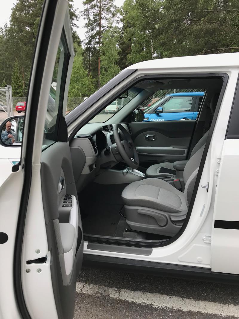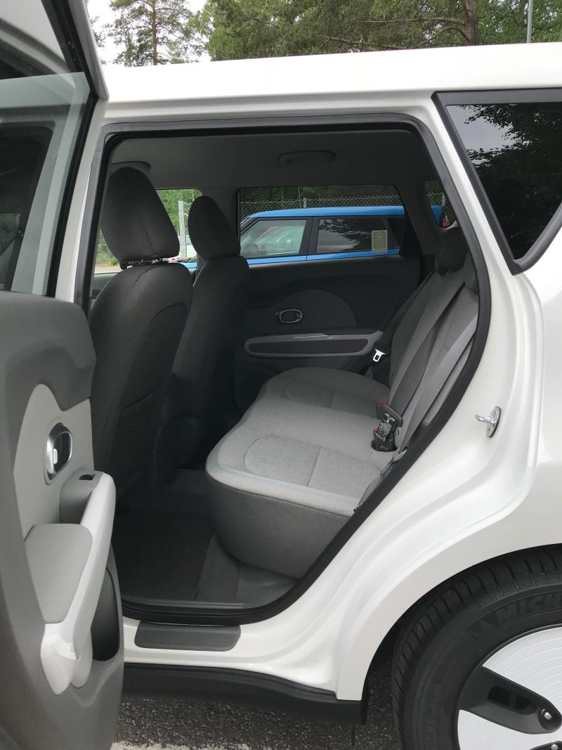 Tässä 4,14 metrin pituisessa, 1,8 metrin levyisessä ja 1,59 metrin korkuisessa autossa on mukavat ja avarat sisätilat neljälle aikuiselle ja kyllä taakse se viideskin istumaan mahtuu, ainakin jos kaikki eivät ole kovin kookkaita ihmisiä. Soul EV on siis hieman Renault Zoeta pidempi ja lähes Ioniqin levyinen. Sisätilat ovat numeroita merkittävästi avarammat. Istuinverhoilu on miellyttävän tuntuista ja sen oloista, että pienet likaroiskeet niistä on helppo pyyhkäistä pois. Kulku korkeaan autoon ja ulos sieltä on myös helppoa.