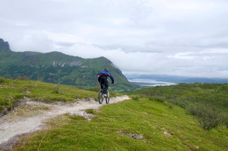 Aamupalan jälkeen pakkasimme päiväreppumme ja suuntasimme Leafilla etsimään alamäkipyöräilyyn sopivaa rinnettä. Ajoimme ensin Kabelvågin kylän keskustassa sijaitsevaan liikkeeseen, jossa palveli myös majoituksemme respa. Sieltä emme saaneet vielä selville sopivia alamäkipyöräilyreittejä, mutta saimme neuvot hakeutua Svolværin turisti-infoon. Siispä ajoimme tuon noin kuuden kilometrin matkan ja saimme hyvät neuvot ja kirjallisuuttakin aiheesta.