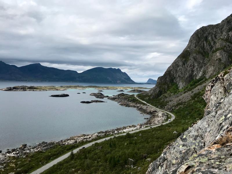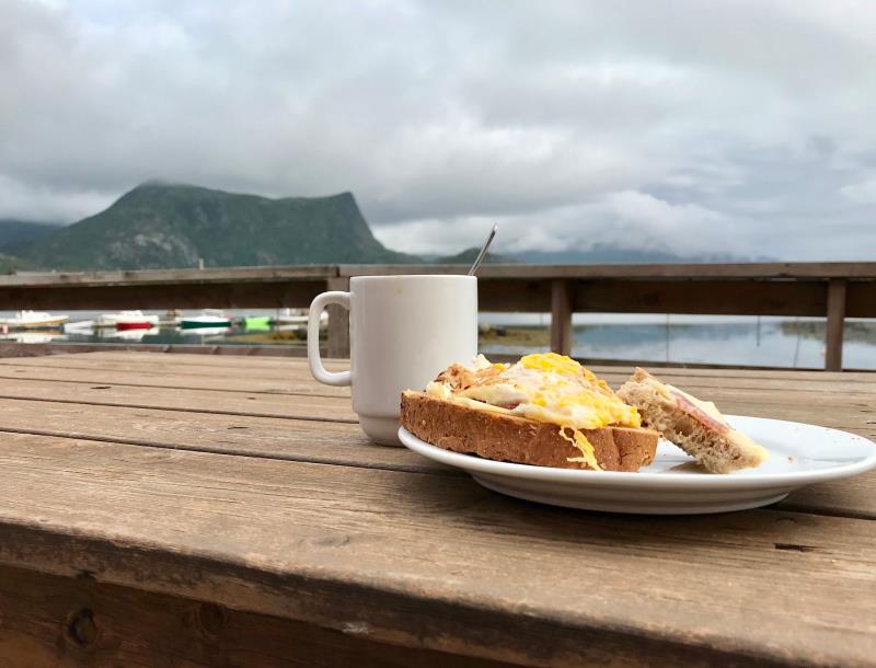 Ohjeiden mukaan lähdimme suuntaamaan kohti noin 60 kilometrin päässä, Leknesissä olevaa polkupyörilyreitin keskikohtaa. Kuitenkin noin 40 kilometrin kohdalla Leknesin alkupäässä E10 tien vasammalla puolella oli ravintola, jossa luki myös Tourist i. Teimme pikapäätöksen pysähtyä siihen lounaalle ja näin poistaa tarpeen kantaa pyöräilyyn mukaan trangiaa ja eväitä. Onneksi pysähtyimme tähän, koska saimme ruuan lisäksi hyvä neuvot kääntyä heti ravintolan vierestä hiekkatielle, ajaa muutaman kilomerin ja lähteä siitä lammashaan läpi kiipeämään vuorenrinnettä.