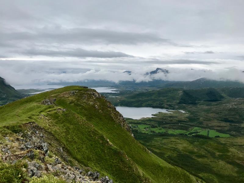 Vuoren huipulle päästyämme pidimme kunnollisen juoma ja evästauon antaen sykkeenkin laskea kunnolla ennen alaslähtöä. Eväiden syönnin aikana ehdimme pojan kanssa ihailla Lofoottien jyhkeitä maisemia. Vuorien korkeuserot ja mittakaavat katoavat näillä vuorilla, koska mitään kiintopistettä ei ole nähtävissä, mihin vertaisi. Mutta olimme sen verran korkealla, että pilviä ajelehti alapuolellamme.