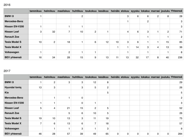 Kia pääsi yllättämään rekisteröintitilastossa viidellä autolla. Soul EV:t ovat todennäköisesti menneet maahantuojan verkostoon. Toivottavasti Kian saatavuus olisi parempi kuin Hyundain.