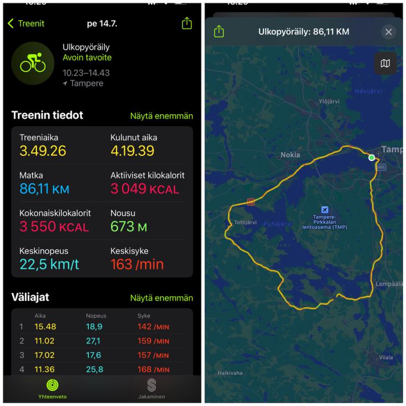 Ajoin hiljattain Endurancellamme Tampereelta Pyhäjärven ympäri, eli hieman 86,11 km pituisen lenkin 3 tunnin ja 49 minuutin ajoajalla. Kokeneille ja hyväkuntoisille katupyöräilijoille tuo matka ei ole mikään suoritus ja keskinopeus on onneton luomupyörälläkin. Minulle se oli hieno suoritus, josta en olisi selvinnyt mitenkään ilman sähköavustusta.