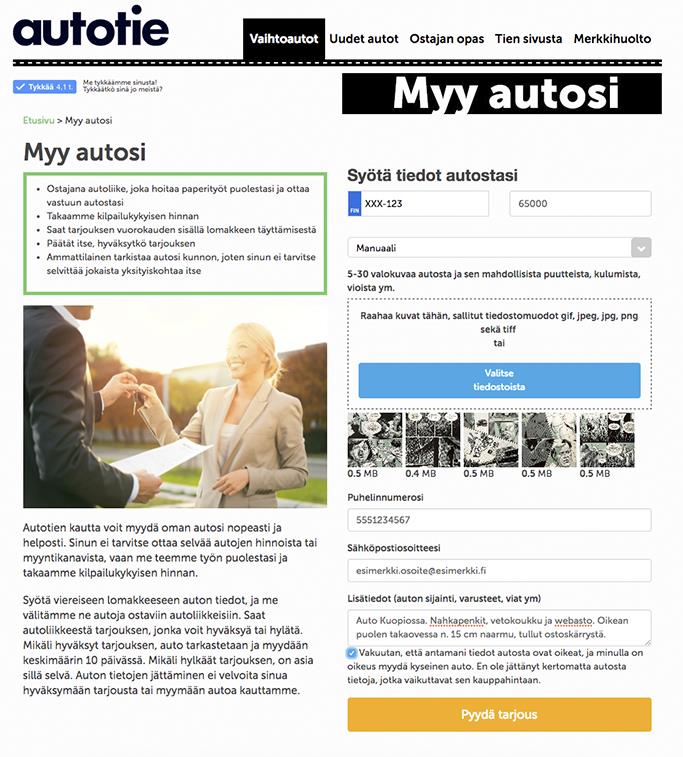 Oman auton kuvien lisääminen yhteydenottoon on nyt mahdollista! Kun jätät yhteydenoton käytetystä autosta, voit liittää oman auton rekkarin ja kilometrien lisäksi tietoihin myös valokuvia. Laadukkaiden kuvien avulla myyjä voi antaa autostasi tarkemman hinta-arvion sitä näkemättä ja itse asiaan päästään nopeammin ilman turhaa nypläystä.