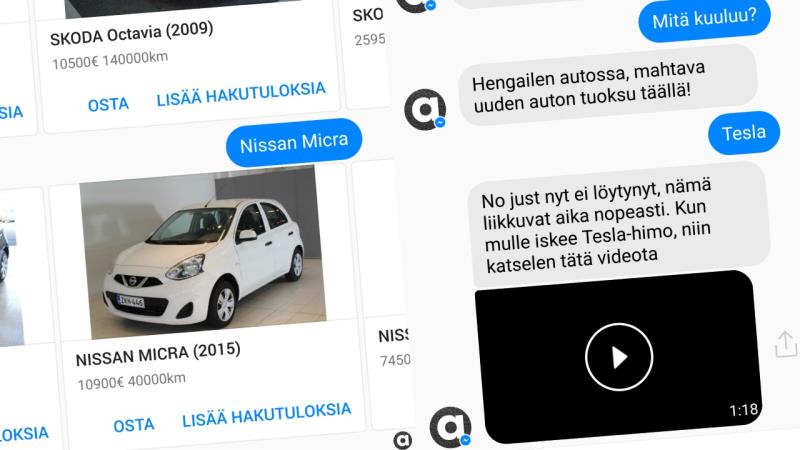 Tuliko FB-messenger-keskustelussa mieleen, että pitäisi varata määräaikaishuolto? Tai ehkä tarkistaa, mitä teinivuosien Toyota Corolla nykyään maksaa? Chatteja ja sometusta ei tarvitse jättää kesken: avaat vain Messenger-keskustelun Autotien kanssa ja kirjoitat vaikkapa ”Ford huolto Seinäjoki” tai ”corolla 1992” ja saat tarvitsemasi tiedon välittömästi. Käy kokeilemassa, Autotie-botilta ei juttu lopu kesken!