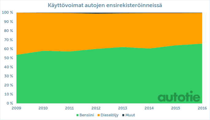 Autojen ensirekisteröinnit näyttävät selvää trendiä vaihteistojen lisäksi myös käyttövoimissa: bensiinikoneet ovat kivunneet vuoden 2009 54 prosentista alkuvuoden 2016 66 prosenttiin. Nousu puolikkaasta kahteen kolmasosaan on ollut suhteellisen tasaista, noin 1,73 prosenttiyksikköä vuodessa.