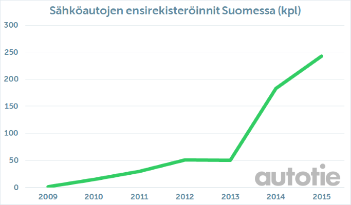 Sen sijaan sähköautojen myynti kasvaa kovaa vauhtia, vaikka onkin kokonaisuudessaan vielä hyvin marginaalisella tasolla. Parhaimmillaan sähköautoja rekisteröidään moninkertainen määrä edelliseen vuoteen verrattuna. Viime vuonna sähköautoja rekisteröitiin ennätykselliset 243 kappaletta, ja nyt alkuvuonnakin rekisteröintejä on ollut 89.