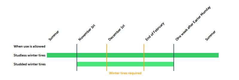 Winter tires have to be used between 1st of December and the end of February. It is not legal to use studded winter tires around the year. Studless winter tires are legal to use even through the summer. It is, however, potentially very dangerous so always use proper winter and summer tires.