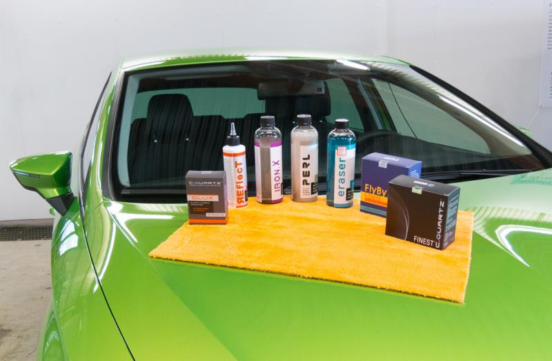 CQuartz DLux muoviosien nanopinnoite, Reflect kiillotusaine, Iron X metallijäämien pesuaine, Perl kumin suoja/viimeistelyaine, Eraser kiillotusjäämien poistoaine, FlyBy Forte ikkunoiden pinnoitusaine (blogaan siitä erikseen!), CQuartz Finest nanopinnoite ja kaiken alla superpehmoinen mikrokuituliina Cquartzin tasoitteluun.