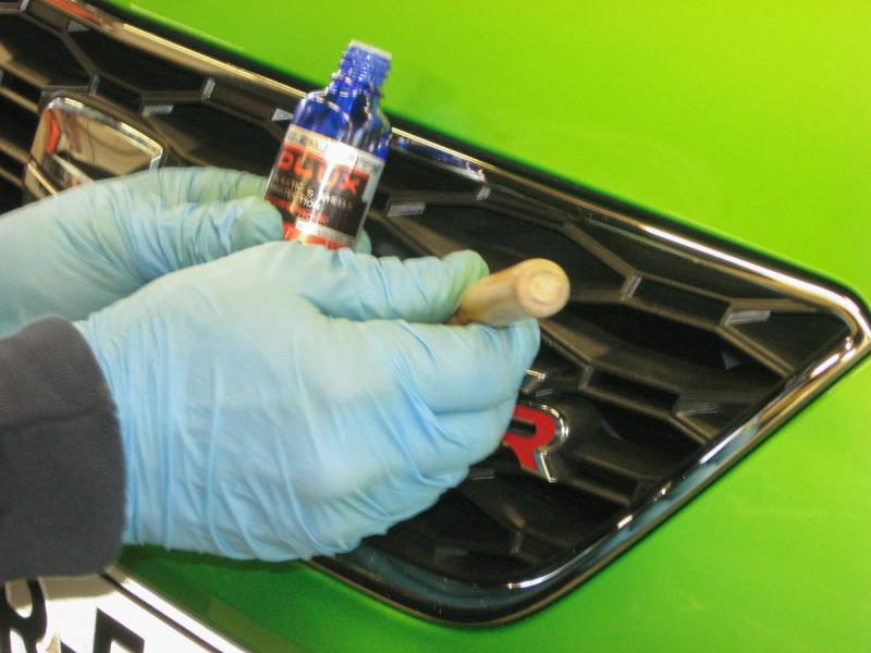 Auton maalipinnat käsitellään CQuartz Finestilla kahteen kertaan. Aine levitetään pintaan ristikkäisin vedoin pieni alue kerrallaan ja silotellaan kuivumisen jälkeen erikoispehmeällä mikrokuituliinalla. Hypistelin liinaa Glosspointilla ja täytyy sanoa, että se oli niin ihanan pehmeä, että siitä pitäisi ommella halinalleja! Hankalan mallisiin pintoihin, kuten Leonin keulan hunajakennosäleikköön, aine levitetään pensselillä ja kaikista vaikeimpiin paikkoihin kynäruiskulla. Kolmen tunnin kuluttua käsittely toistetaan. Maalaamattomat muoviosat käsitellään Finestin sijaan CQuartz DLux:illa, joka sisältää enemmän kvartsia ja tekee paksumman suojakerroksen.