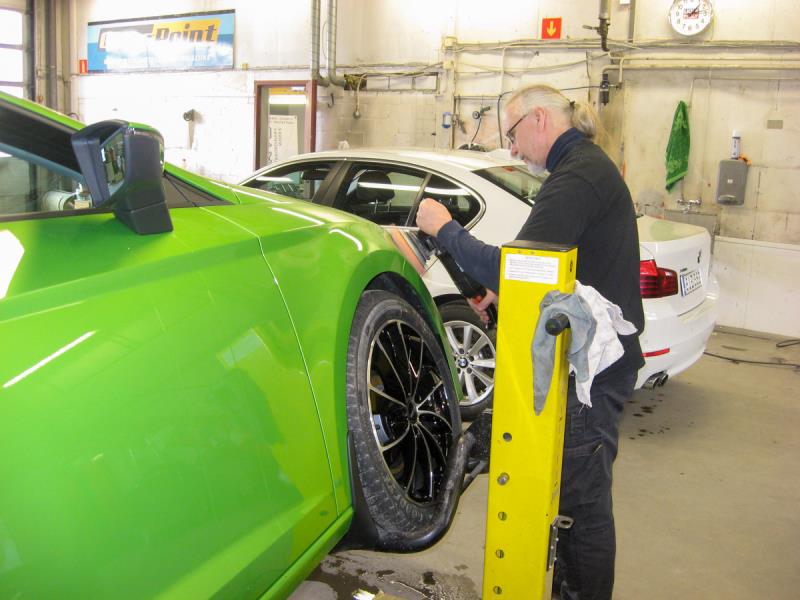 Maalipinnan kiillotusta epäkeskokoneella. Auto kallistetaan käsittelyä varten, jotta kyljet näkee paremmin - ja onhan tuo työasentonakin mukavampi.