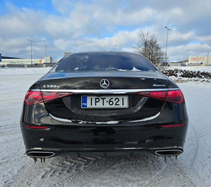 Tästä voidaankin sujuvasti hypätä auton varusteisiin. Ei liene mikään yllätys, että S580e:n varustelista on todella pitkä. Tästä autosta ei vain yksinkertaisesti puutu varusteita. Niitä ovat esimerkiksi 19‑tuuman alumiinivanteet, 9‑vaihteinen automaattivaihteisto, 360‑kamerajärjestelmä, adaptiivinen AIRMATIC‑ilmajousitus, aktiivinen tunnelmavalaistus, Burmester‑äänentoistojärjestelmä, hierontaohjelmat etu‑ ja takapenkeillä, HUD‑heijastusnäyttö, 3D‑kuljettajanäyttö, langaton puhelimen lataus edessä ja takana, lämmitys ja tuuletus etu‑ ja takapenkeillä, nahkaverhoilu, sähkösäätöiset ja muistitoiminnoilla varustetut penkit edessä ja takana (reunapaikoilla), sähkötoiminen panoraamakattoluukku sekä Thermotronic‑monialueilmastointi. Turvallisuus‑ ja ajoavustimista löytyy esimerkiksi jalankulkijoille varoitusääni ja aktiivinen pysäköintiavustin, lukuisten muiden avustimien lisäksi.