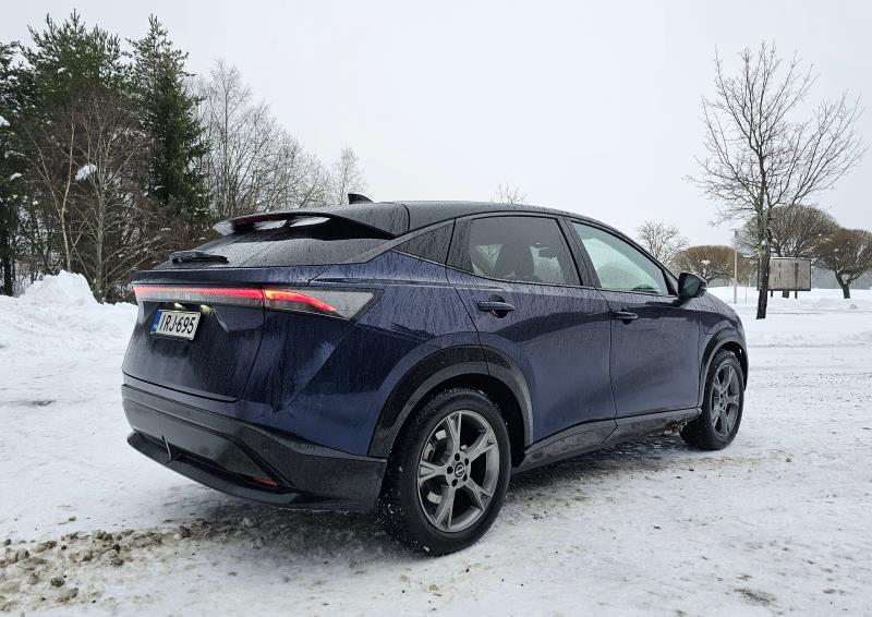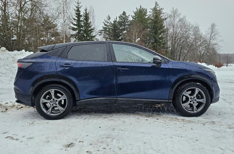 Entä sitten Ariyan visuaalinen anti? Ulkomuotoilun puolesta auton tunnistaa nopeasti Nissaniksi. Siinä on paljon samoja piirteitä ja vivahteita kuin esimerkiksi siinä iki-ihanassa Qashqaissa, eli muotoilun puolesta auton pitäisi olla helposti lähestyttävä kapistus meille suomalaisille. Ehkä ainoa moite ulkonäössä liittyy siihen, että jonkinlaista pientä särmää olisi saanut olla enemmän (samaan tapaan kuin esimerkiksi Renault Scenic E-Techissä). Silloin auto erottuisi paremmin edukseen parkkirivistä. Mutta, nämä ovat toki puhtaasti makuasioita.