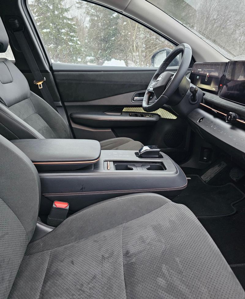 Sisältä auto on minimalistisen ylellinen ja jotenkin… skandinaavinen. Tuntuu siltä kuin joku olisi ottanut skandinaavisen ”hygge”-käsitteen ja lisännyt siihen hieman japanilaista eleganssia. Tämä pätee ainakin tällaiseen synteettisellä mokkaverhoilulla olevaan versioon, jollainen koeajoauto oli. Mokkaverhoilussa vain on ajatonta tyylikkyyttä ja myös sellaista tietynlaista premium-fiilistä. Kaiken kaikkiaan Ariyan sisätiloissa vallitsee hyvä feng shui ja selkeä harmonia. Siinä missä Scenic E-Techissä oli (näin jälkeenpäin ajateltuna) ehkä jopa vähän liikaakin kaikenlaista meneillään, on Ariya täysin toista maata ja ehkä enemmän varttuneeseen makuun sopiva valinta.