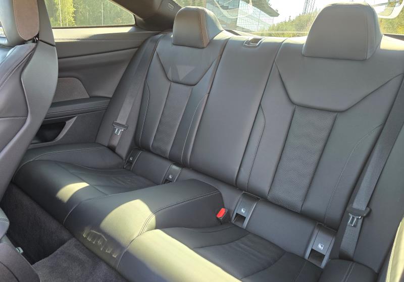 Koska M4 on kaksiovinen, pitää etupenkit kaataa, jotta takapenkeille pääsee istumaan. Etupenkit siirtyvät sähköisesti eteenpäin, kun selkänojan kallistaa, helpottaen taakse nousemista. Tosin, kiitos pienen takareisivaivani ja 194-senttisen pituuteni, en taipunut nyt takapenkkejä valitettavasti testaamaan. M4:n kaltaisen auton kohdalla saanen tämän kuitenkin anteeksi, koska tällaisessa autossa on kyse niin paljon muusta kuin takapenkkien tiloista.