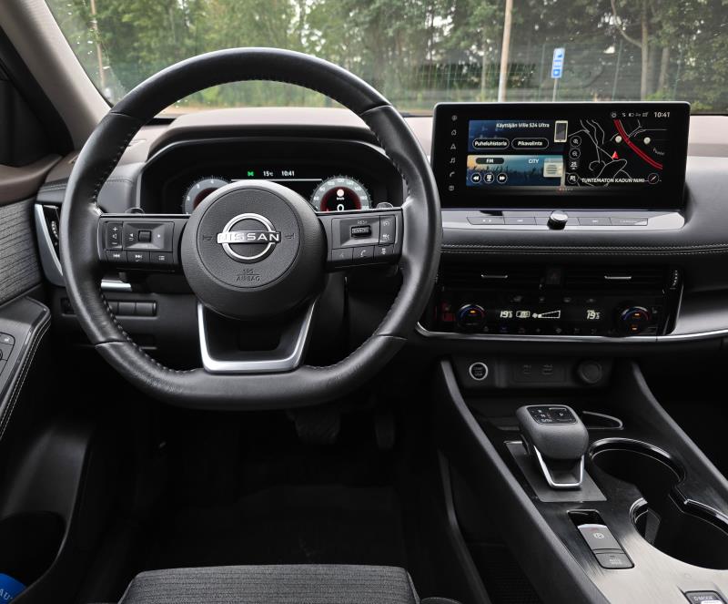 Tämä kyseinen X-Trail on voimalinjaltaan kevythybridi, eli siinä on 1,5 litran kolmisylinterinen ja turboahdettu bensiinimoottori, jota avustaa pieni 12 voltin sähkömoottori. Auton kokonaisteho on yhteensä 161 hevosvoimaa ja vääntöä siitä löytyy 300 Nm. Nollasta sataseen se kiihtyy 9,6 sekunnissa, eli ei puhuta siis mistään raketista. Omaan makuuni potkua saisi olla vähän enemmän. Tosin, mainittakoon, että ainakin uusista e-Power -hybridiversioista tehoa löytyy yli 200 hevosvoimaa ja nelivetoisista e-4orce -versioista puolestaan yli 210 hevosvoimaa.
