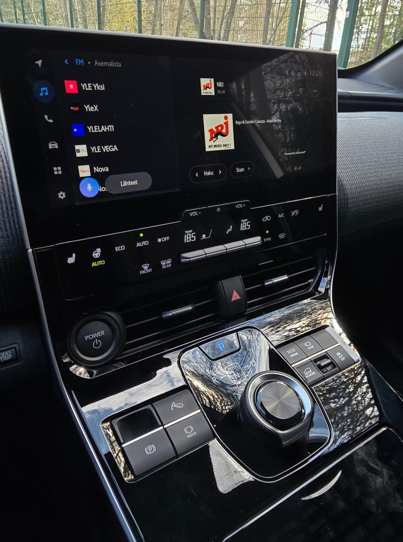 Keskikonsolista löytyy 12,3 -tuumainen näyttö ja sen alapuolelta useita fyysisiä painikkeita. Painikkeilla saa tässä autossa säädettyä kaikkia auton toimintoja, halleluja! Keskinäytön takaa löytyy Toyotan oma, hyvin pelkistetty käyttöliittymä, jonka kautta kautta hallinnoidaan käytännössä vain navigointia ja radiota. Navigoinnista puheen ollen, Toyotan oma karttapalvelu ei tunnu olevan kaikilta osin enää aivan ajan tasalla. Onneksi autosta löytyy kuitenkin myös tuki Android Auto ja Apple CarPlay -palveluille. Pidän itse kovastikin Android Auton käyttöliittymästä ja toimivuudesta, joten vaikka Toyotan oma järjestelmä onkin toiminnoiltaan melkoisen köyhä, tuki Android Autolle pelastaa paljon ainakin omalla kohdallani. Sitä paitsi, esimerkiksi Android Auton takaa löytyvä Googlen karttapalvelu onkin sitten aivan ajan tasalla.