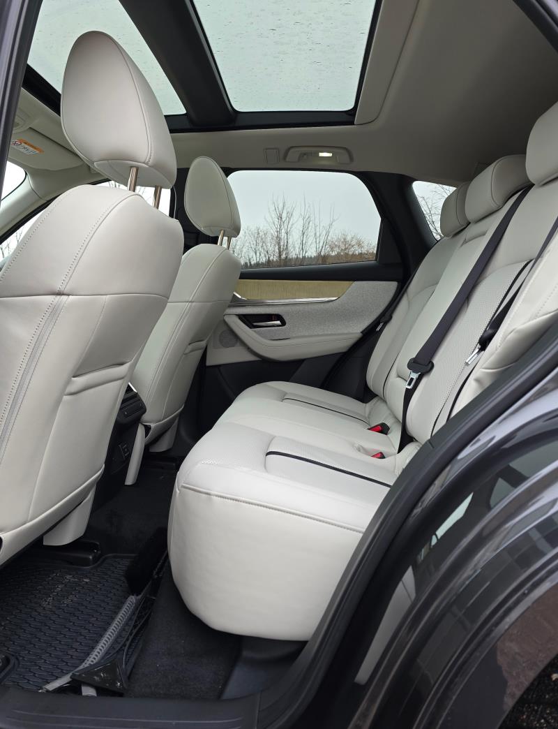Takana jalkatila jää kuitenkin pidemmälle matkustajalle melko niukaksi, etenkin jos etupenkki on säädetty vastaavankokoiselle kuljettajalle. Polvet ottavat helposti etupenkkiin kiinni. Lyhyemmille matkustajille ja lapsille takatilat riittävät kuitenkin mainiosti, joten pienelle perheelle CX-60 on edelleen varteenotettava vaihtoehto.