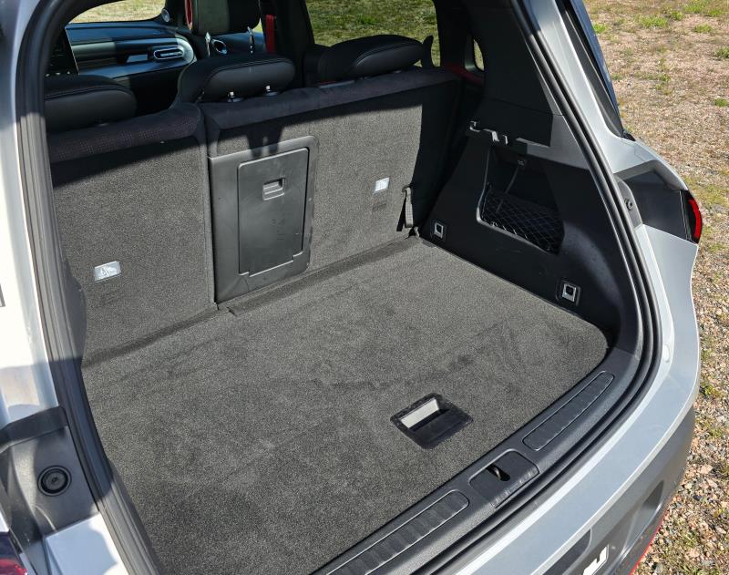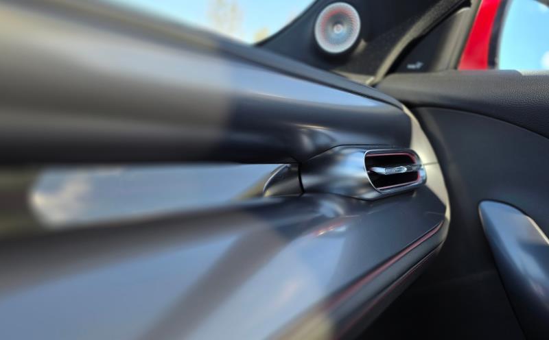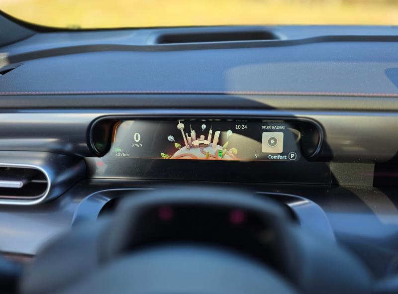 Olin itse ohjaamossa heti kuin kotonani, mikä on aina hyvä merkki. Vaihteenvalitsin löytyy oikeasta viiksestä, aivan kuten Mersuissakin, pyyhkimiä hallinnoidaan puolestaan vasemmalla viiksellä. Keskikonsolista löytyy kansien alta mukitelineet ja paikka puhelimen langatonta lataamista varten. Autosta löytyy iso 12,8 -tuumainen keskinäyttö ja sen alta fyysiset painikkeet muutamille tärkeimmille toiminnoille. Digitaalinen mittaristo on pieni, mutta persoonallinen, ainakin graafiselta ulosasultaan. Penkit ovat mikrokuitumokkanahkaa ja niissä on mukava istua. Tosin, huomasin oman penkkini kohdalla tiukemmissa kurveissa jonkinlaista ikävää natinaa. Ehkä kyse oli vain yksilökohtaisesta ongelmasta. Tuuletusaukoista löytyy tyyliteltyjä yksityiskohtia ja kojelaudassa on kiiltävää, metallinhohtoista muovia. Vaikka sisätiloissa ei sinällään nähdä mitään kovin mullistavaa, varmistavat persoonalliset yksityiskohdat sen, että autosta löytyy omanlaistaan luonnetta myös sisältä.