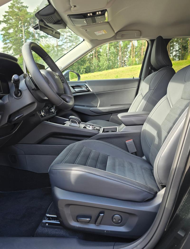 Auton ohjaamonäkymä on sinällään aika pelkistetty, mutta sitä kautta myös selkeä ja toimiva. Hyppäys edellisestä koeajoautosta, Polestar 4:sta Outlanderiin tuntuu melko radikaalilta, koska futuristinen ja scifi-henkinen tyyli on vaihtunut johonkin niin perinteiseen, mutta tietyllä tapaa tuntuu myös siltä, kuin kotiin palaisi. Outlanderin ohjaamo huokuu tuttua ja turvallista, ja tarkoitan tämän nimenomaan kehuna.