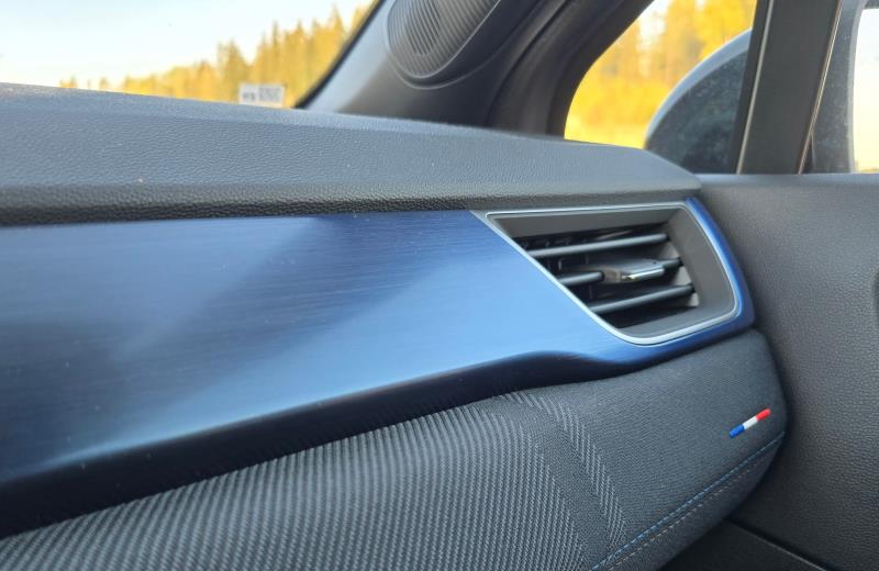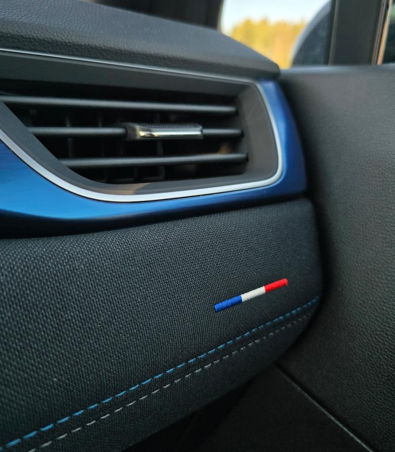 Tyylikkyys jatkuu pääosin myös sisätiloissa. Yleisilme ohjaamossa on nimittäin vahvasti plussan puolella. Se on selkeä, mutta siitä löytyy kivoja, persoonallisia yksityiskohtia. Esimerkiksi pieni Ranskan lippu kojelaudan oikeassa laidassa, Ranskan lipun väreillä tehdyt tikkaukset ratissa ja siniset reunat turvavöissä. Kojelaudassa oleva muovipaneelikin on sinisellä sävytetty. Autosta löytyy lisäksi Alpine-logot etupenkeistä. Alpine on siis Renaultin omistama kilpa- ja urheiluautomerkki.