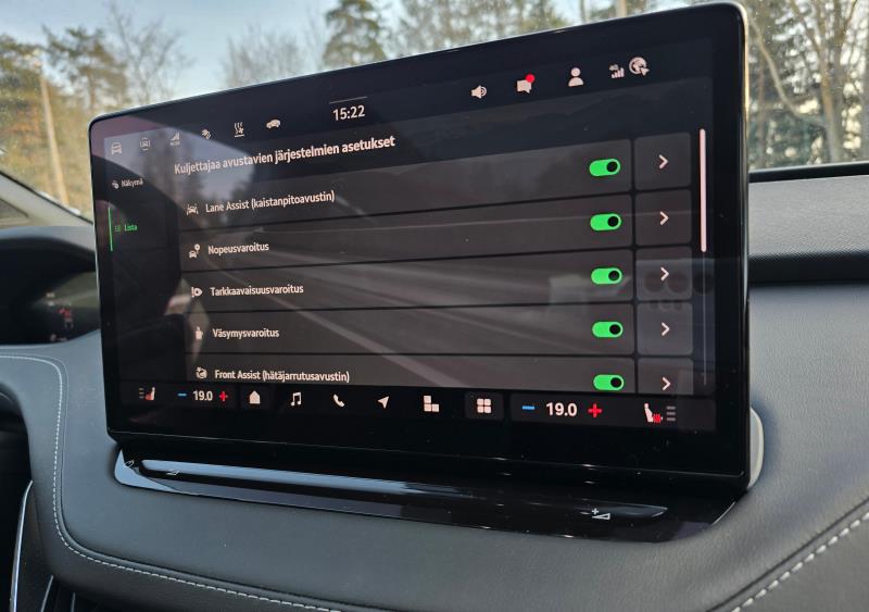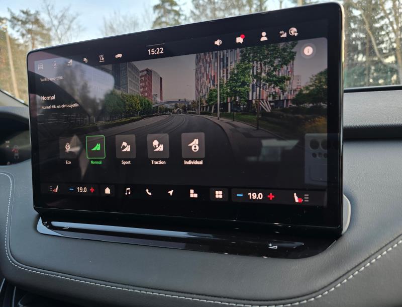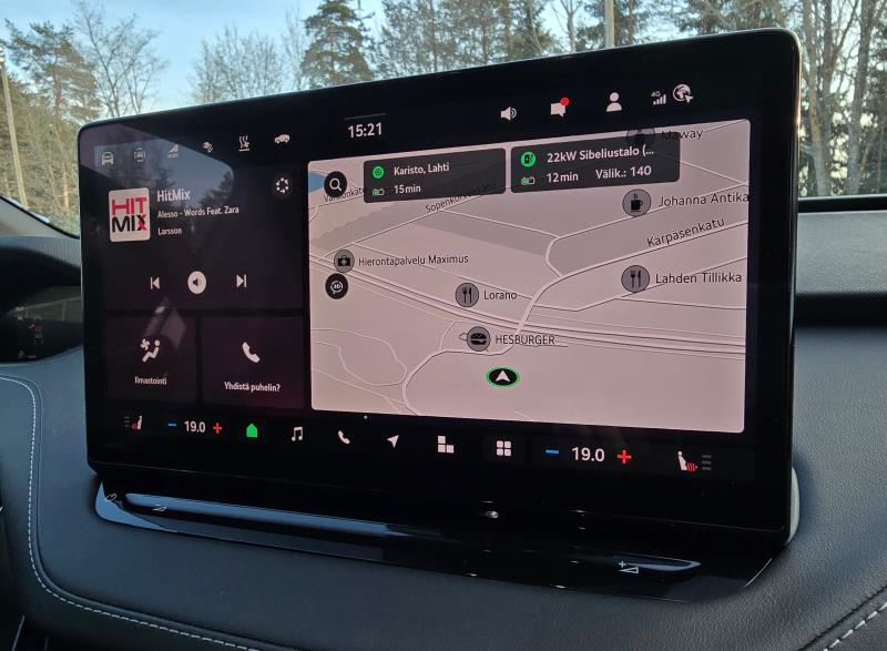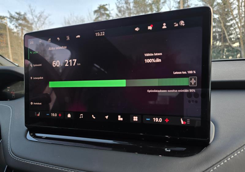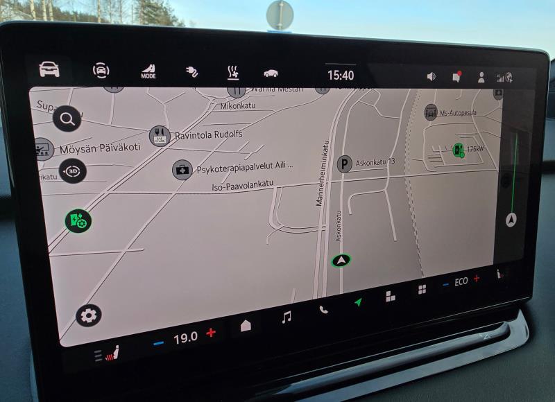 Enyaqistakin toki löytyy iso kosketusnäyttö keskeltä, mutta sen alapuolelta löytyy tosiaan myös fyysiset painikkeet ainakin tietyille tärkeille toiminnoille, kuten esimerkiksi sille tuulilasinpuhaltimelle. Sen verran tosin täytyy kehua keskinäytön takaa löytyvää navigointijärjestelmää, että se näyttää selkeästi lähistöltä löytyvät latausasemat ja jopa sen, että kuinka suurella teholla niissä pystyy autoa lataamaan.