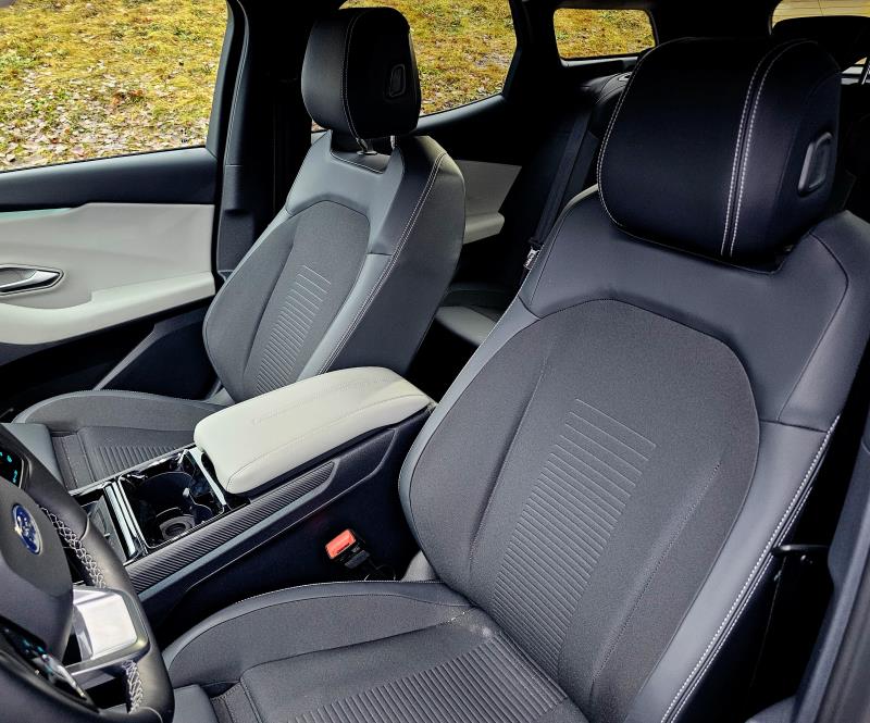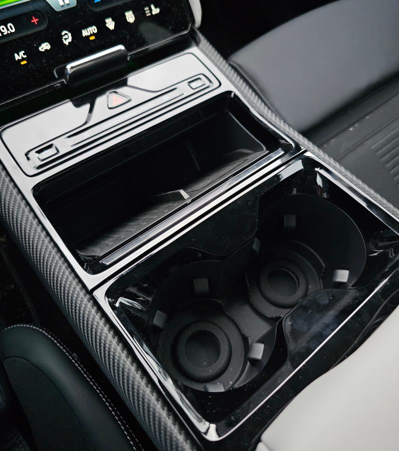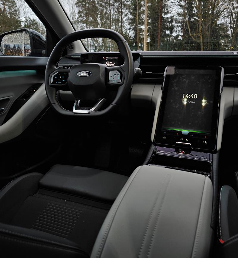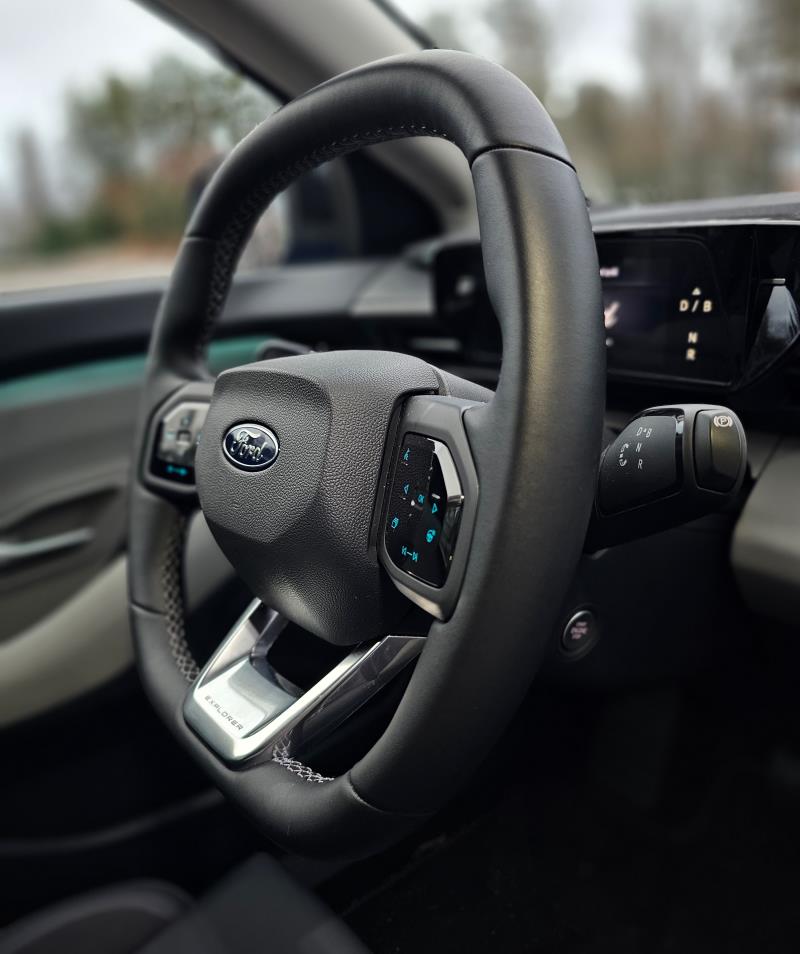 Miltä auto sitten näyttää sisältä? Sisätilat ovat selkeät ja järkevät, eli tässä huomaa taas tämän eurooppalaisuuden, sillä kaikki amerikkalainen mahtipontisuus loistaa poissaolollaan. Pois lukien suuri (14,6 -tuumainen) keskinäyttö, joka tästäkin autosta löytyy, mutta sellainen löytyy nykyään lähes poikkeuksetta kaikista sähköautoista, joten se on sinällään vähän huono argumentti. Ja, vaikka Explorerin sisätilat eivät ehkä mitään vau-efektiä aiheutakaan, ne ajavat asiansa erittäin hyvin. Jos käytännöllisyyttä mietitään, autosta löytyy edestä esimerkiksi kaksi langatonta latauspaikkaa puhelimille, kätevästi sijoitetut mukitelineet (joita ei esimerkiksi Volvo EX30:ssa ollut laisinkaan ja jotka Renault Scenic E-Techissä oli sijoitettu ergonomian osalta hyvin hankalasti), muutamia fyysisiäkin painikkeita (esimerkiksi ikkunoiden säätämiseen ja ajovaloihin liittyen) sekä ratin painikkeet, joista esimerkiksi äänenvoimakkuutta saa kätevästi kasvatettua liu’uttamalla sormea miinuspainikkeelta pluspainikkeelle (sinällään pieni asia, joka kuitenkin jäi mieleen). Eikä unohdeta tietystikään keskikonsolin säilytystilaa eli MegaConsolea, jonne mahtuu 17 litran edestä tavaraa. Okei, MegaConsole jos mikä on suuri ja mahtava, eli hyvin amerikkalainen elementti.