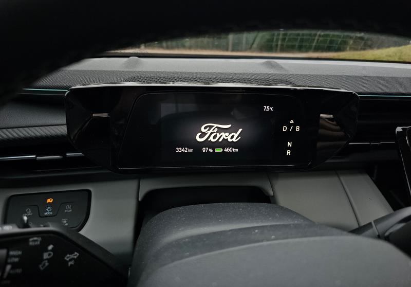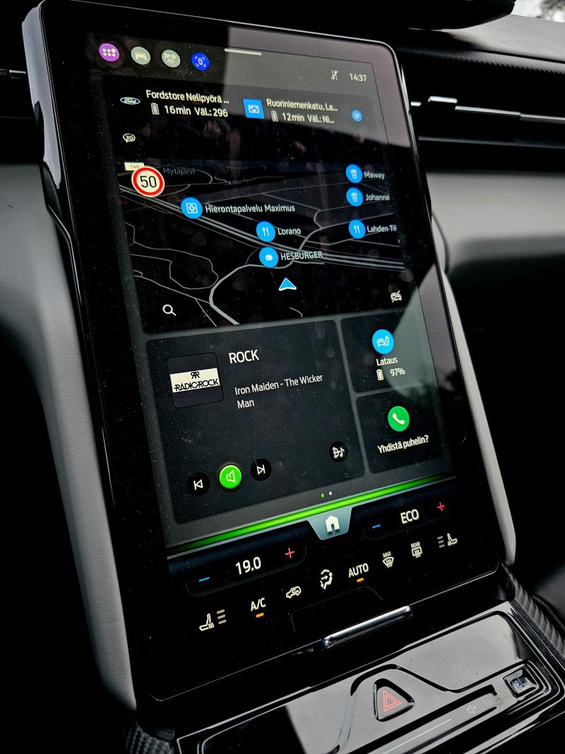 Palatakseni muuten vielä tuohon keskinäyttöön, sen käyttöliittymä on varsin selkeä ja pelkistetty. Toisin kuin esimerkiksi EX30:ssa ja Scenic E-Techissä, Fordin käyttöliittymänä ei ole Googlea, vaan heidän oma järjestelmänsä (Ford SYNC). Sen kautta hallitaan esimerkiksi erilaisia ajotiloja (joita ovat Eco, Normal, Sport, Traction ja Individual), ajoavustimia, navigointia ja seurataan myös kulutusta.