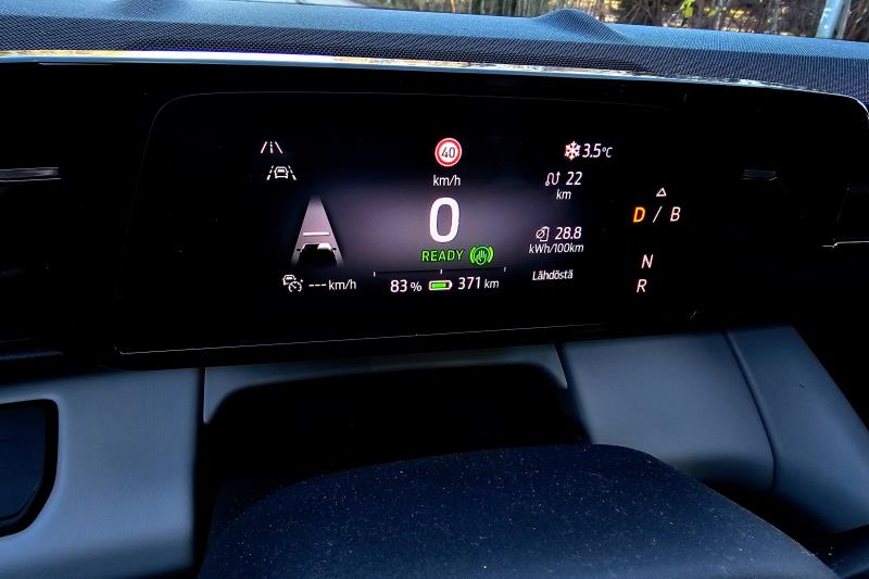 Ilma oli varsin viileä, vain parin asteen verran plussan puolella, mutta range ei näyttänyt missään kohtaa putoavan kovin dramaattisesti. Lähtiessäni Lahdesta auton antama kapasiteettilukema oli 83-prosenttia (sen hetkinen range 371 kilometriä) ja saapuessani takaisin mastokaupunkiin puolestaan 65-prosenttia (jäljellä oleva range oli silloin 297 kilometriä). Laskeskelin, että kokonaisajomatkaa tälle reissulle kertyi kaiken kaikkiaan 77 kilometriä, eli ajotietokoneen antama range piti kutinsa lähes täydellisesti (iso peukku siitä, koska näin ei ole ollut monenkaan ajamani sähköauton kohdalla).