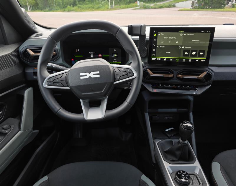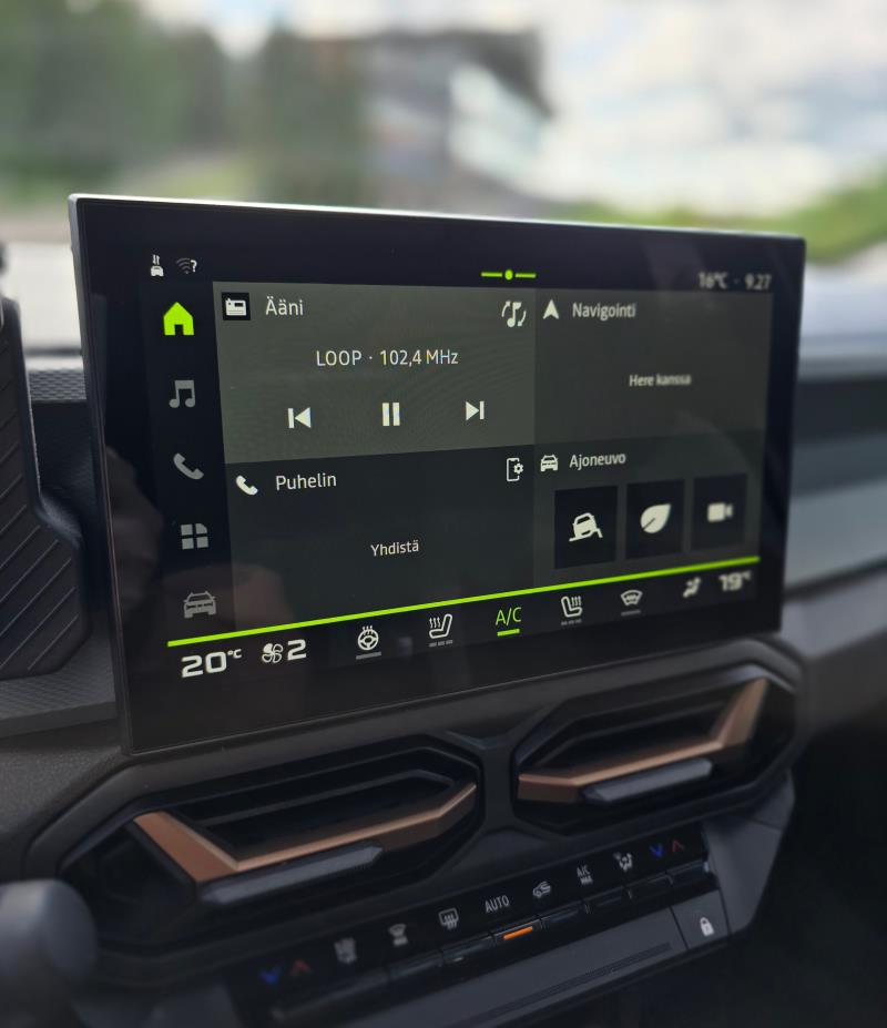 Sisältä auto on melko muovinen, kuten odottaa saattaa, mutta ohjaamon yleisilme on itse asiassa siitä huolimatta melko vahvasti plussan puolella. Kojelaudasta löytyy esimerkiksi tyylikkäitä, kuparin värisiä yksityiskohtia, jotka antavat autolle äijämäistä rouheutta. Digitaalinen mittaristo ja keskinäyttö ovat aika tummanpuhuvia ilmeeltään, mutta niiden resoluutio ja pikselitiheys näyttävät olevan kohdallaan, sillä kaikki tekstuurit ovat varsin teräviä. Tämä on ehdottomasti positiivinen yllätys, sillä näin ei edelleenkään ole läheskään kaikkien uusien autojen kohdalla. Keskinäytön takaa löytyvä käyttöliittymä ei ole aivan identtinen emoyhtiö Renaultin uusista malleista löytyvän kanssa, mutta on siinä toki paljon samoja elementtejä. Hyvin helppokäyttöinen se on joka tapauksessa ja varsin looginen myös toiminnoiltaan.
