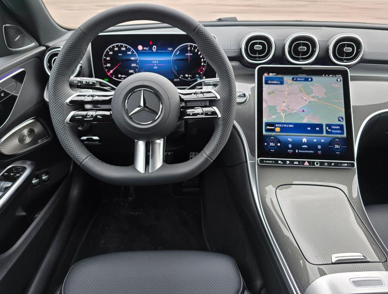 Konservatiivisuus päättyy kuitenkin välittömästi ohjaamoon astuessa. Sisätilat edustavat ylellisyyttä tavalla, joka suorastaan hyppää silmille – mutta hyvällä tavalla. Lukuisat kromiset yksityiskohdat, kiiltäväpintaiset materiaalit kojelaudassa ja suuri, kallistettu kosketusnäyttö keskellä kertovat välittömästi, että nyt istutaan, toden totta, premium-luokan menopelissä. Tämänkin sukupolven C-sarjan ohjaamossa on itse asiassa käytetty inspiraationa S-sarjaa ja miksipäs ei. Onhan S-sarja kuitenkin Mercedeksen kruununjalokivi ja tietynlainen mittapuu monille luksusautoille ylipäätään.