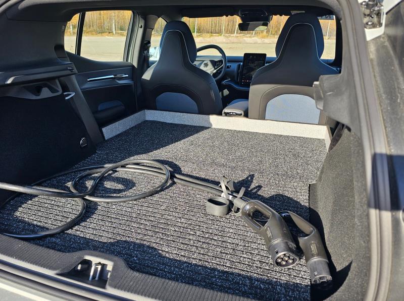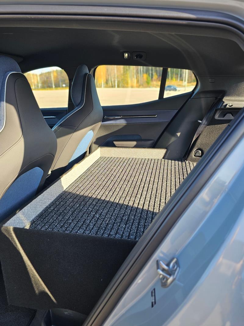 Entä sitten istuintilat etupenkillä? Isokokoisena, 194 senttisenä ja 125 kiloisena kuljettajana sitä on tietysti aina mukavampi ajaa, kun on tarpeeksi tilaa istua. Ei EX30 mikään mahdoton tilaihme ole, mutta onnistuin saamaan itselleni varsin hyvän ajoasennon. Eikä Van-versiossa tietysti tarvitse huolehtia, että mahtuuko isokokoisen kuljettajan taakse ketään istumaan, kun niitä takapenkkejä ei tosiaan ole.