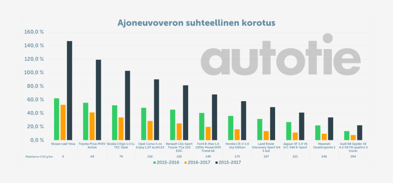 Ajoneuvoveron suhteelliset korotukset esimerkkiautojen päästöluokissa 2015 – 2016, 2016 – 2017 sekä 2015 – 2017. Kuva aukeaa isommaksi klikkaamalla. Tarkat luvut löytyvät artikkelin lopusta.