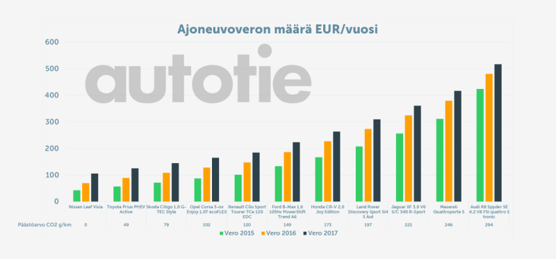 Nouseva ajoneuvovero on ollut suhteessa kova isku päästöluokkien matalimmassa päässä. Nollapäästöisten autojen vuosittainen ajoneuvovero oli vielä vuonna 2015 vain 43,07 euroa vuodessa, kun se ensi tammikuusta alkaen on 106,21 euroa vuodessa. Alle kahdessa vuodessa veroa on tullut maksettavaksi lisää noin 63 euroa, mikä tekee 147 prosenttia korotusta.