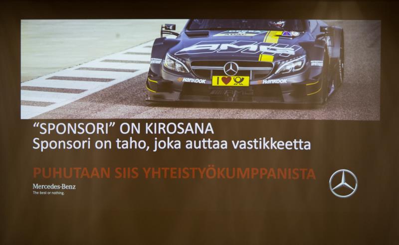 Yhden tapahtuman kiinnostavimmista puheenvuoroista piti Vehon viestintäpäällikkö Pekka Koski. Ohjelmassa esityksen nimi oli sponsorihankinta, mutta heti alkajaisiksi Koski jyrähti, sponsorointi on kirosana, sillä sponsori auttaa vastikkeetta. Onkin puhuttava yhteistyökumppaneista.