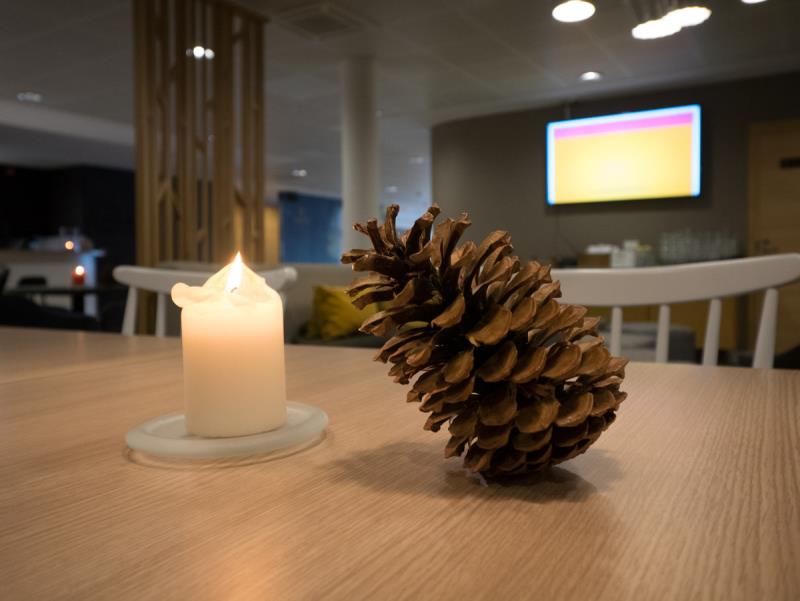 Tapahtumapaikkana toiminut Hotelli Sveitsi oli mukava tuttavuus ja voisin kuvitella meneväni sinne toistekin. Vasta remontoidut tilat olivat viihtyisät ja kivan näköiset. Tykkäsin erityisesti seinien kokoisista luontovalokuvista ja isoista kävyistä, jotka toistuivat logoissa ja koristeissa.