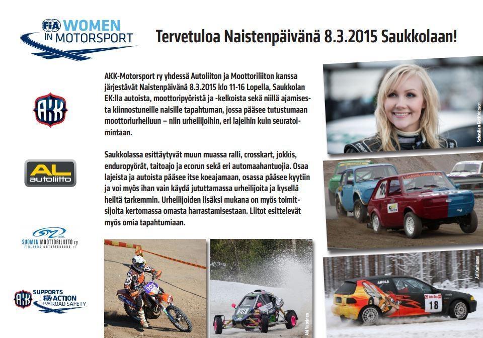 AKK Motorsport ry:n, Autoliiton ja Moottoriliiton yhteisvoimin järjestämässä tapahtumassa pääsee tutustumaan lukuisiin eri moottoriurheilulajeihin, -urheilijoihin, heidän kalustoonsa ja seuratoimintaan. Esiteltävinä lajeina ovat mm. ralli, crosskart, jokkis, enduro, taitoajo ja ecorun. Autojen kyytiin pääsee ja osalla on mahdollista myös ajaa itse ammattilaisten opastuksella. Tämä tosin säävarauksella, sillä vielä ei tiedetä, missä kunnossa radat ovat. Ja hei, saa sinne tulla vaikka olisi mieskin. Naisilla vain on etuajo-oikeus kyydityksiin. :) Eikä muuten maksa mitään!