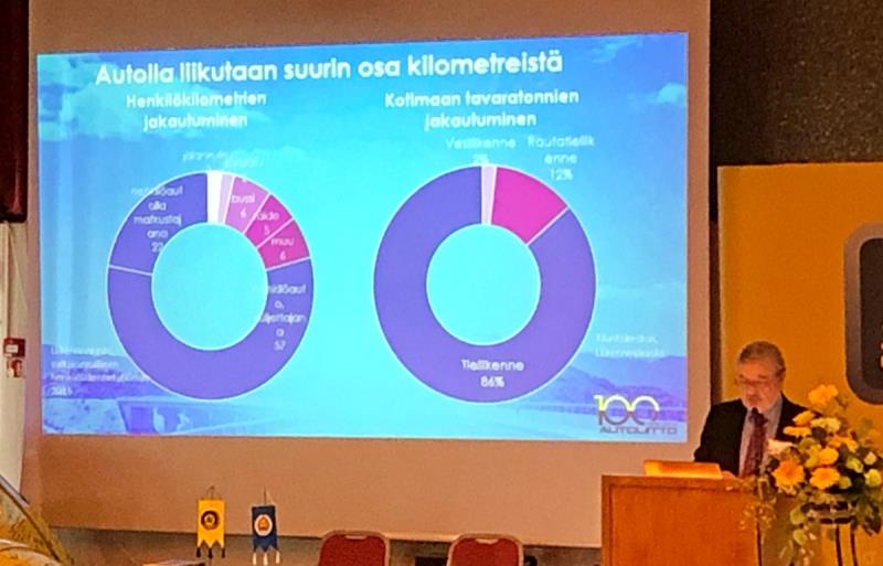 Martti Merilinna kertoi, että Suomen liikenteen kilometreistä suurin osa tapahtuu autoilla. Henkilöliikenteestä 57% on auton kuljettajana ja 22% matkustajana. Bussilla kulkee 6% ja raiteilla 5%. Tavarasta puolestaan 86% kulkee kumipyörillä.