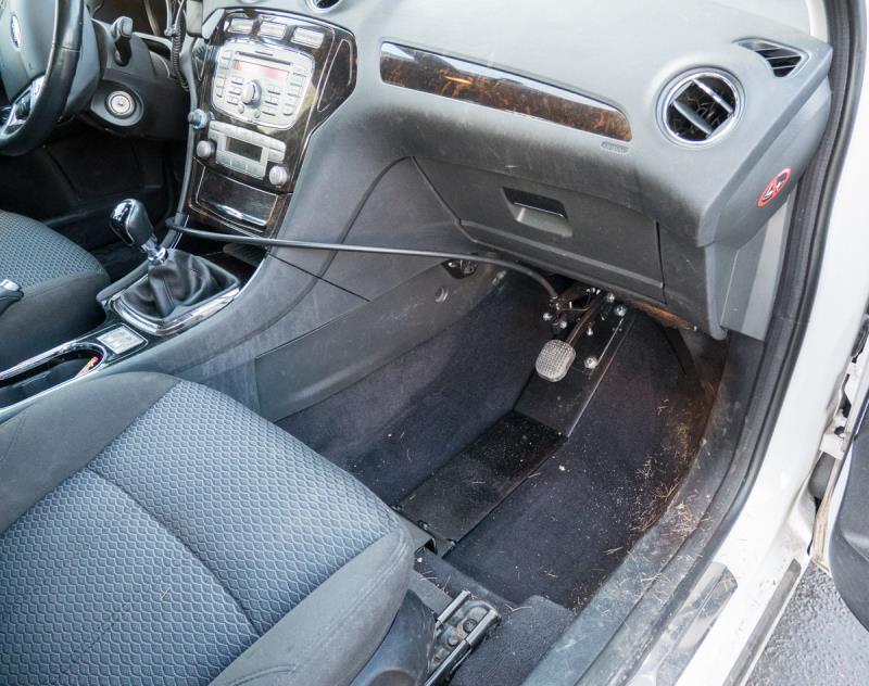 Kävin katsomassa tilaisuuden jälkeen Mondeoon asennettua poljinta. Se oli tosi nätisti pultattu kiinni metallilevyyn, joka oli puolestaan kiinnitetty matkustajan penkin kiskoon.