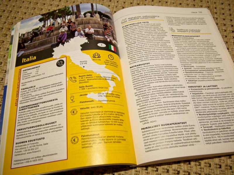 Yhden pikku virheen tein kirjan kanssa road tripillä. Unohdin sen Italiaan ajamisen ajaksi laukkuuni, kun painettiin vaan kaasu pohjassa ja takki auki menemään! Luin kirjan ennen reissua, mutta tietoa on niin valtavasti, ettei sitä kaikkea voi muistaa.