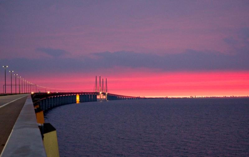 Ruotsin ja Tanskan yhdistävän Juutinrauman sillan ylittäminen henkilöautolla maksaa 52 euroa paikan päällä maksettuna ja 47 e verkossa etukäteen ostettuna. Me saimme reissullamme kaupan päälle upean auringonlaskun!