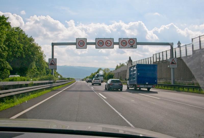 Kaista- ja ajoneuvokohtaisia nopeusrajoituksia ja muita liikennemerkkejä moottoritiellä Saksassa.