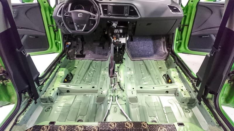 Auton pohjapellin päälle liimattiin 2 mm paksua butyylimattoa ja sen päälle vielä 4 mm paksua kaksikerrosmattoa, joka on yhdistelmä butyylimattoa ja solukumia. Tätä paksummin vaimennusmattoja ei voi laittaa, koska muuten auton alkuperäinen lattiaverhoilu ei istuisi enää nätisti siihen päälle.
